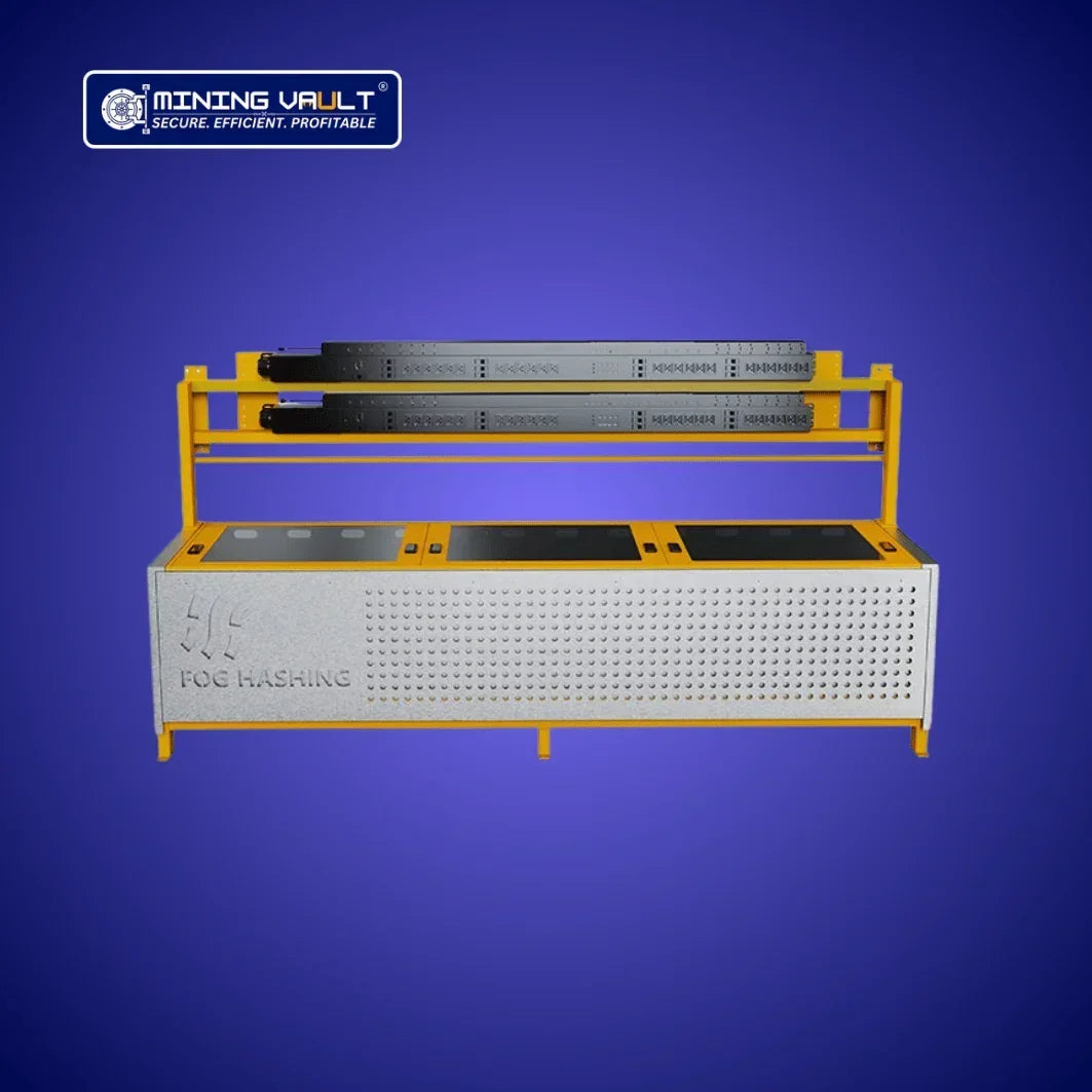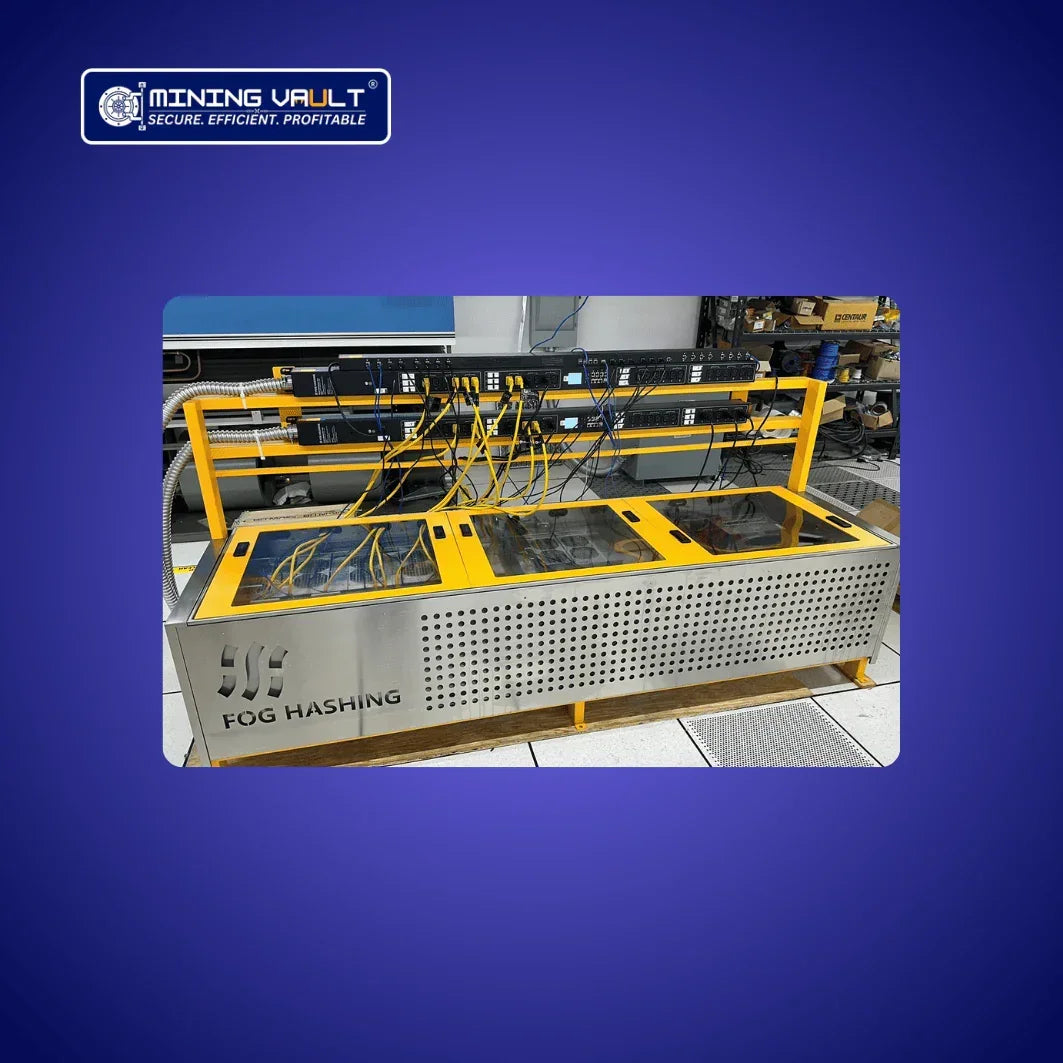 Installations de minage de crypto-monnaie Mining Vault avec matériel informatique et câblage organisé Kit d'immersion Mining Vault B24D avec 24 Antminers ou 30 Whatsminers pour minage crypto Appareil de minage de crypto-monnaie FOG HASHING avec cadre jaune et panneau blanc perforé sur fond bleu Plateforme de minage Fog Hashing avec câbles jaunes, équipement informatique pout des bitmain antminer Machine de minage Bitcoin industrielle Fog Hashing avec câbles et châssis métal orange sur fond bleu